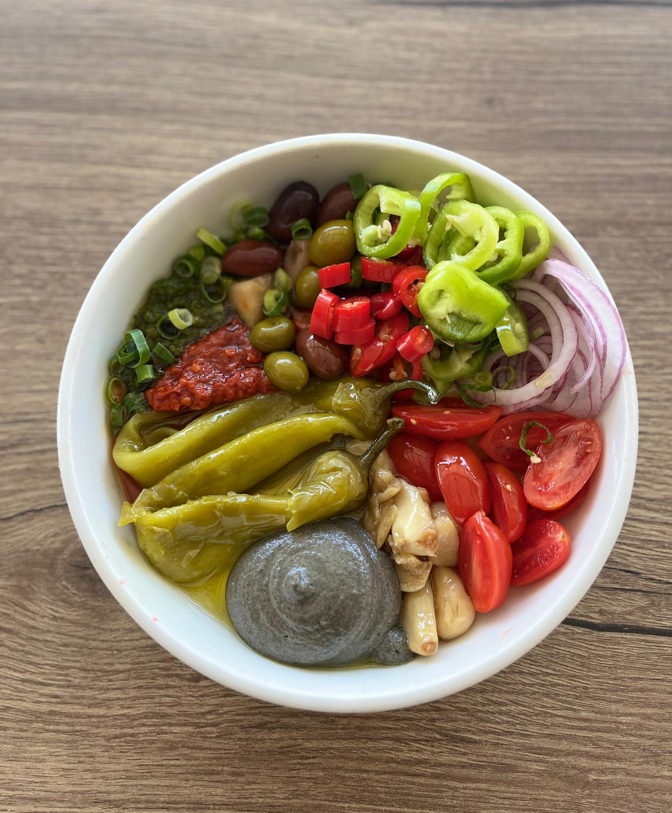 פלפלים מטוגנים, קרם חציל שחור, פלפל שיפקה, סחוג בעבודת יד, זיתים ירוקים וקונפי שום