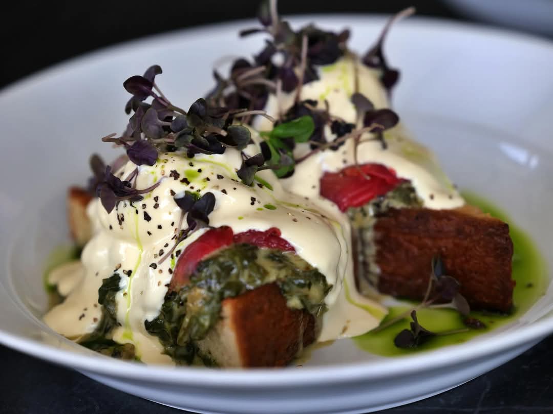 2 ביצים עלומות, רוטב הולנדייז, תרד טורקי, בצל מאודה בשמנת מתוקה ועירית, על בריוש קסטן צרוב על הפלנצ'ה